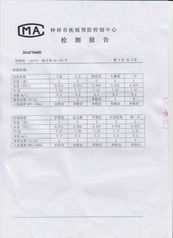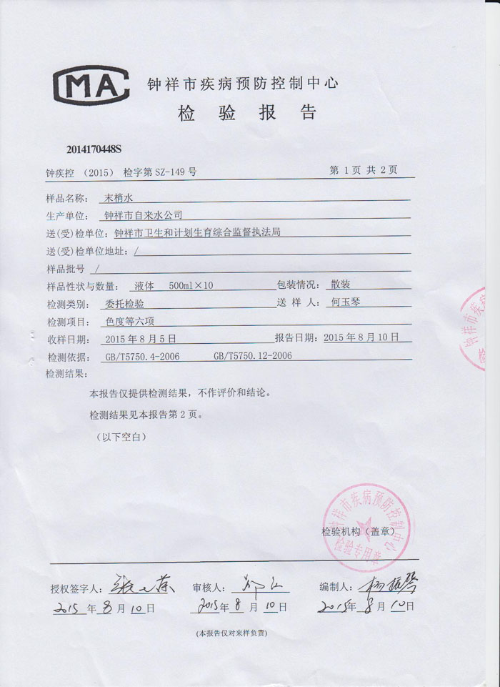 2015年8月10日钟祥市疾病预防控制中心检测报告(末梢水)